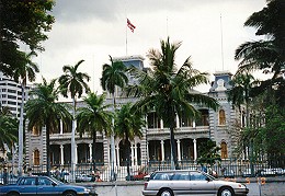 正面にあるイオラニ宮殿(写真右)も同様。右見て左見てと忙しい。じっくり見たいのであれば、 後からバスやトロリーで来た方がよい。