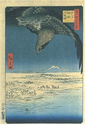 安藤広重は15歳の時歌川派豊広の門人となり、南宗画・四条派の絵も習得し、 はじめ美人画・役者絵を描いていたが、1833年「東海道五十三次」を板行。 一躍名声を得て風景版画家の第一人者となった。 代表作に木曾街道六十九次・江戸名所・京都名所などがある。