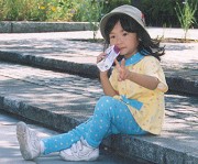 「まにゃ」が着ているのは GYMBOREE で買った上下。 上は $26、下は $18 。 このほかに同じ柄の帽子も購入した。こちらは $12。 原色系のデザインが特徴でとにかく可愛い。