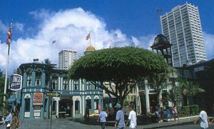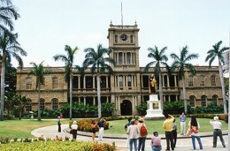 正面にあるイオラニ宮殿(写真右)も同様。右見て左見てと忙しい。じっくり見たいのであれば、 後からバスやトロリーで来た方がよい。