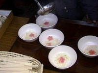 上には生麩をモミジのように形、色付けをしている。眺めてよし、食べておいしい、うどんも入って